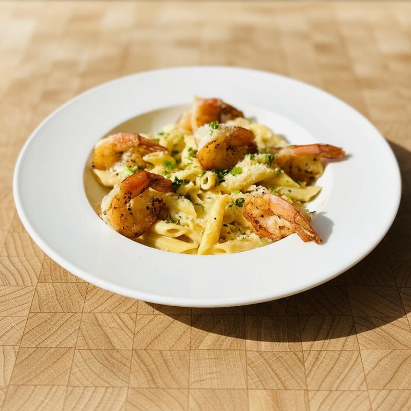 Grilled shrimp. Penne pasta. Creamy gorgonzola Alfredo that makes regular Alfredo feel insecure.