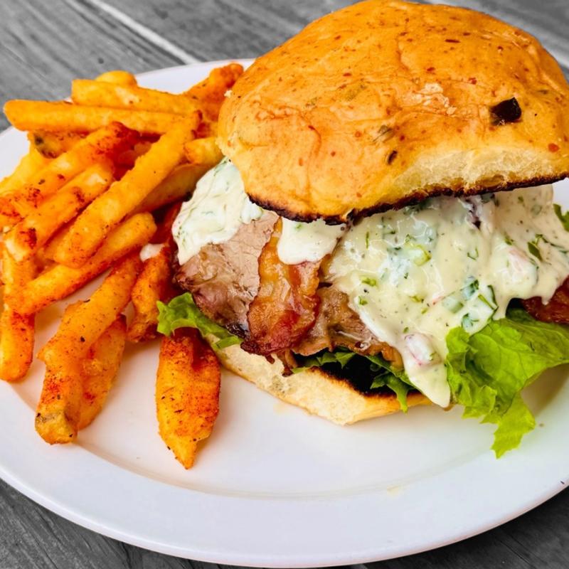 Our most talked about sandwich: Smoked Picanha, bacon, ham, swiss, chimichurri mayo, jalapeno cheddar sourdough bun