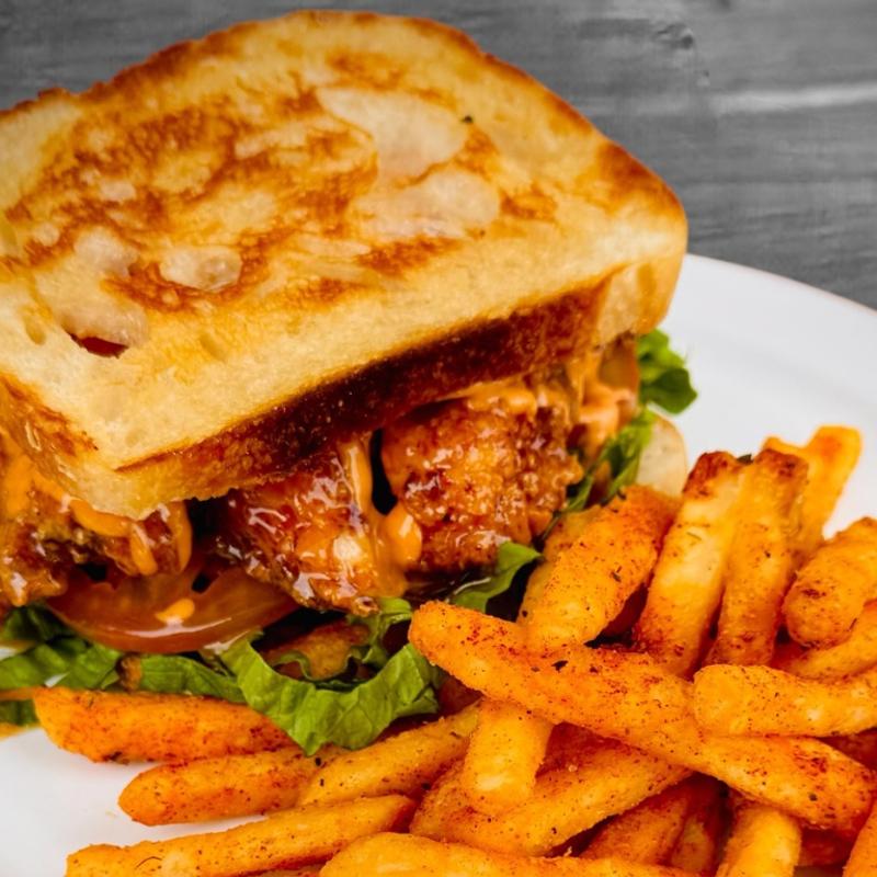 A grilled chicken sandwich with a bite. The foundation of this sandwich is an 8oz premium grilled chicken breast, bronzed, & smacked with Pepper Jack, lettuce, and tomato on an awesome Martin's bun and served with our famous battered fries.