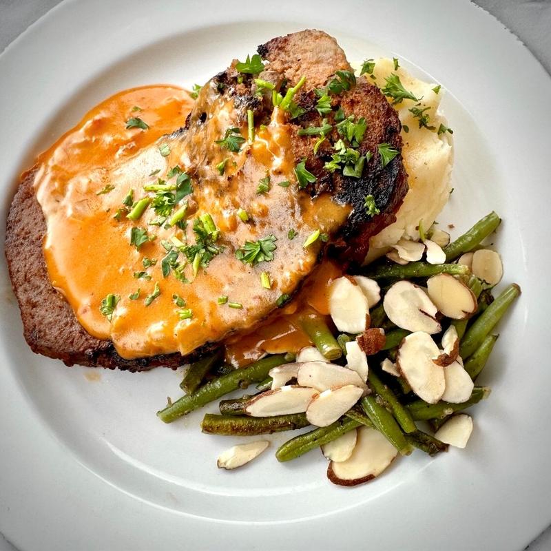 Dig into a true comfort classic with a flavorful twist! Our House-Made Meatloaf is crafted from the finest ground beef from our butcher shop, ensuring a tender, savory bite in every slice. Smothered in our scratch-made sambal gravy, it delivers a rich depth of flavor with a hint of spice. Served alongside creamy mashed potatoes and a fresh green bean almondine, this dish is a perfect balance of hearty and wholesome, bringing a little extra warmth to your meal